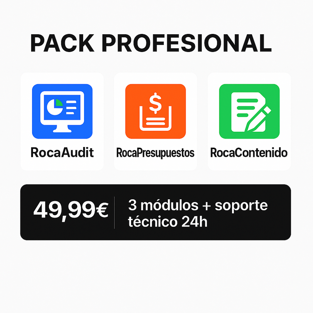 El Pack Pro de RocaTools reúne las tres herramientas clave para quien necesita operar de forma ágil, profesional y automatizada desde el primer día. Ideal si estás lanzando servicios, captando clientes o sistematizando procesos sin depender de terceros.